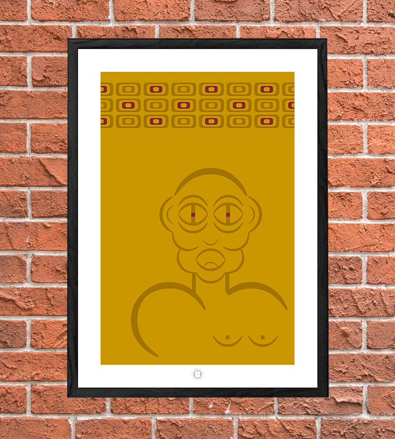 Another being, much like the green one but mustard staring straight at you. Another strange yet alluring creature, with a tribal patterned background. Think about how you would describe this androgynous piece or art to your visitors… Interesting?