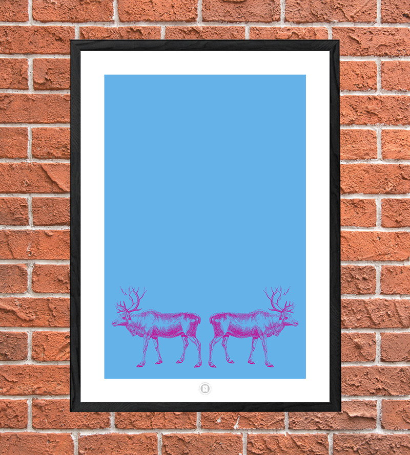 A strong pair of proud Reindeer stand side by side in this minimalist piece. Bright pink on a baby blue solid background – check out the other wonderful beasts in this matching range to create your own wall of super bright wildlife.