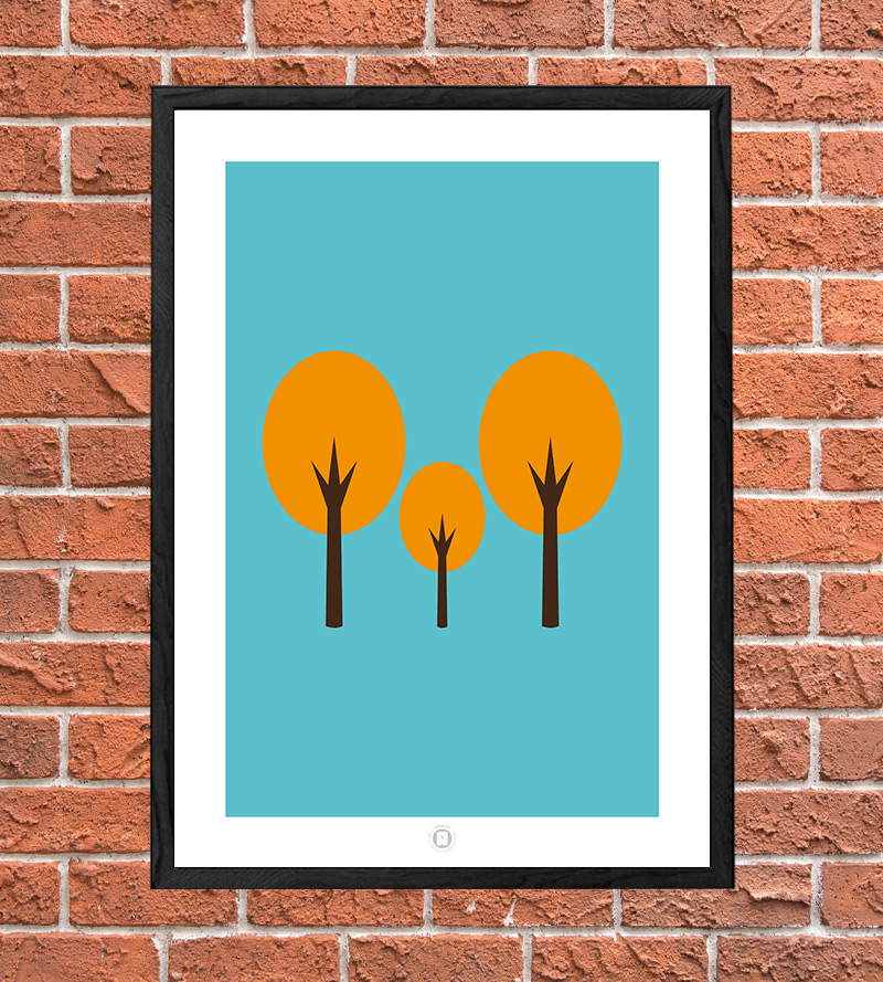 What a strange thing, a tree that looks like an egg, how utterly wonderful. To add to your wonderment we don’t have just one, but three eggtree’s in this particular print. These particular eggtree’s are blooming in a rich orange with a bright solid blue background.
