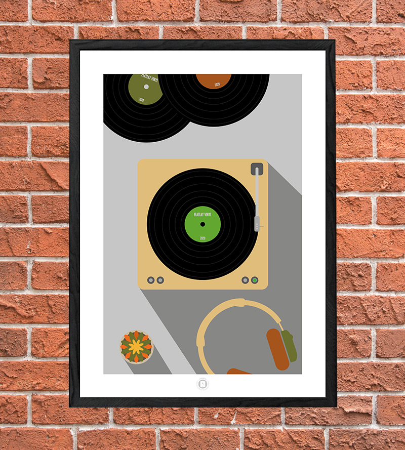 Delightfully warm, crackling vinyl! There are few things better than listening to your favoutite music and listening to it on vinyl is (in our opinion), the only way to do it. What could make it even better is being able to look at one of our beautiful prints while listening, may we suggest our Flatlay Vinyl Green print – perfect! The print on the label says FLATLAY VINYL 2020.
